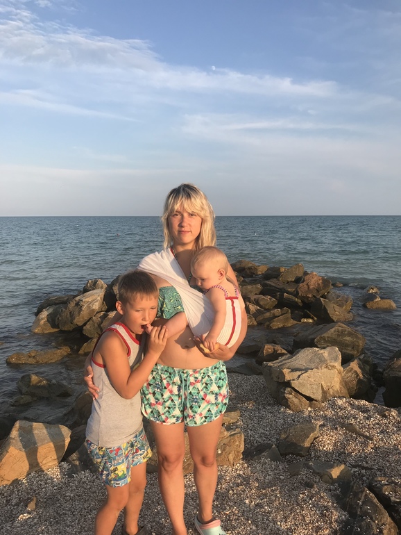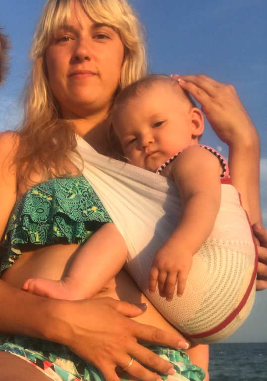 В море заходили. В водиче прохладной так не пищит, а только охает, а на руках не хочет в морьке купаться. Да и мне в слинге спокойнее в море заходить. Когда вышли - накинула на нее полотенце, полотенце впитало и можно дальше ити не снимая ляльку. Единственное что писяет в слинге и течет все если не переодеть после моря🤪