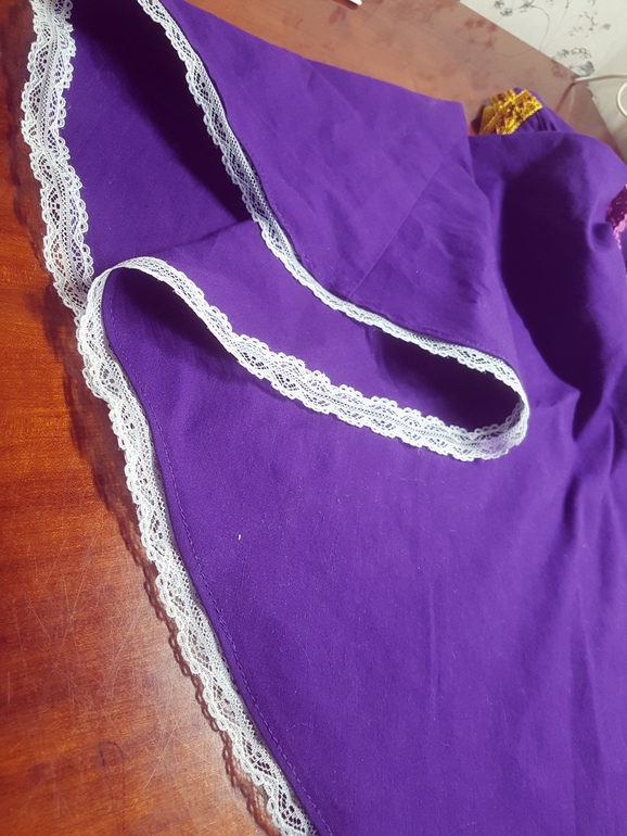 На воротнике и манжетах кружевные ленты пришивала вручную.