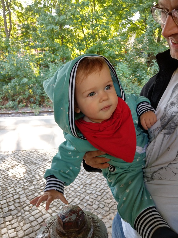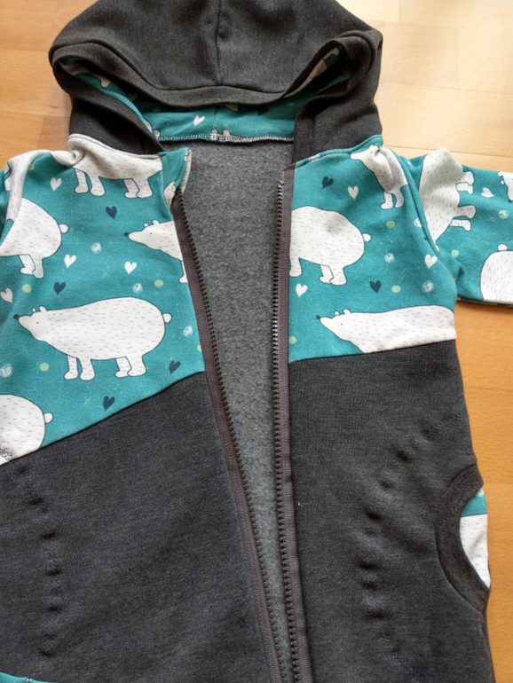И напоследок курточка, думаю Тим до нее не раньше весны дорастет. Но большая - не маленькая, пригодится. Материал софтшелл, внутри трикотаж, на кнопках. Выкройка zipfeljacke Bella, скачивала бесплатно где-то на просторах интернета. Добавила карманы.