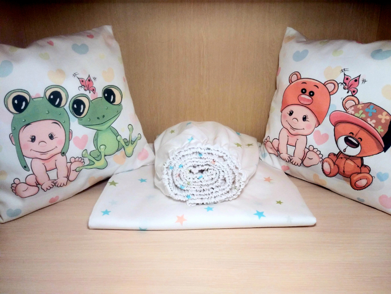 Комплект в кроватку с бортиками состоит из простыни на резинке, пододеяльника, наволочки. Сшит из сатина, состав 100 % хлопок.