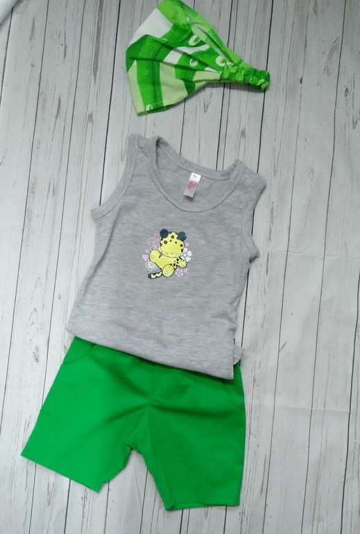 Остатки от пошива летних брюк для сына, превратились в шорты 98 рр. К ним по цвету дошила косынку и получился летний лук.