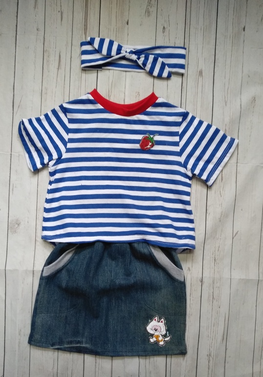 Кусочки полосатый кулирки от комплекта Family look сложились в асимметричный топ 98 рр. Юбка из старых джинс перешита для комплекта