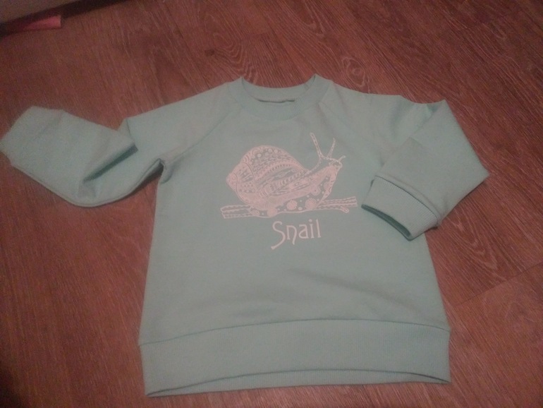 Выкройку укоротила на ширину пояса 5см. Футер с/л 2 нитка. Кашкорсе в тон на поясе и манжетах. Белый термотрансфер.