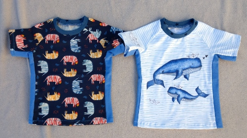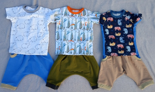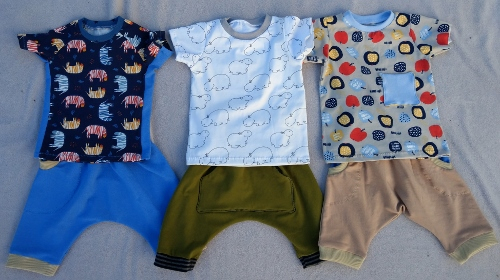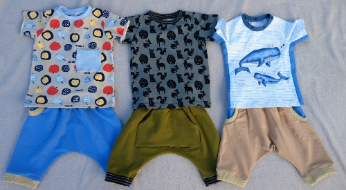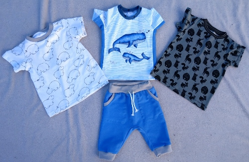 Какое всё красивое , моднявое, стильное! Такое в магазине не купишь. Умничка мама! Киты 🐋, вставки в футболках по бокам и крой штанишек прям любовь!