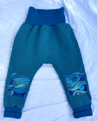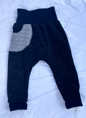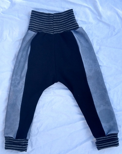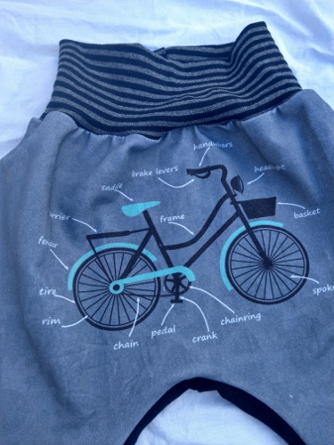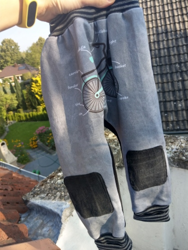 Понадобилось дополнительно несколько штанишек, все 4 по выкройке Lybstes Schlafanzug. С велосипедом и белые из футера петельки, черные и синие из футера двухнитки, на манжетах рибана. Заплатки-тигры из софтшелла, черные из джинсы.