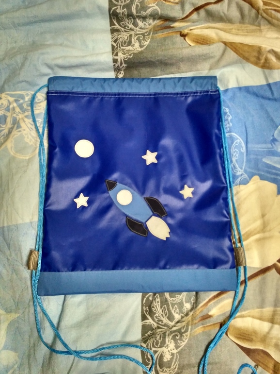 Шьем полезностиДобрый вечер! Сын пошел в школу на подготовку, и за несколько раз мне так надоело таскать в пакетах обувь: рвется, пачкается, нести в руках неудобно, что в один вечер меня переклинило, что нужно сшить сумку. Мама на мою идею покрутил у виска, дескать она стоит 100р в магазине, чего мучиться. Но для меня это не мучение, а наоборот отрада и снятие стресса. Выбор плащевок у меня совсем не велик, поэтому проблем с этим не было, название не помню, но самая недорогая в местном магазине, голубая это дюспо и серая светоотражающая лента. Но просто синего цвета мне не хотелось, поэтому решила, что нужна аппликация, заодно поучусь-потренируюсь. Плащевку шила второй раз (первый раз из этой же ткани шила сумку-почтальона в группу сыну в д/сад), оказалось аппликации из неё делать совсем не сложно, даже наоборот понравилось мне)))