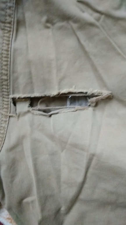 У меня муж новые летние льняные брюки порвал ключами, оч похоже на ваш порез,только спереди. Я вокруг них ходила и так и сяк, в итоге ничего не придумала, заплатки там глупо, зашивать видно, единственный вариант перешить ребенку на шорты.