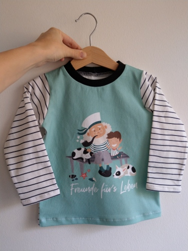 Недавно у деда (свекра) был день рождения, и я решила сшить ему в подарок кофту сыну (его внуку))) Они очень дружат, и мне попалась милая панелька, в свободном переводе "друзья навеки". Выкройка Basicshirt от Lybstes, обе ткани кулирка.