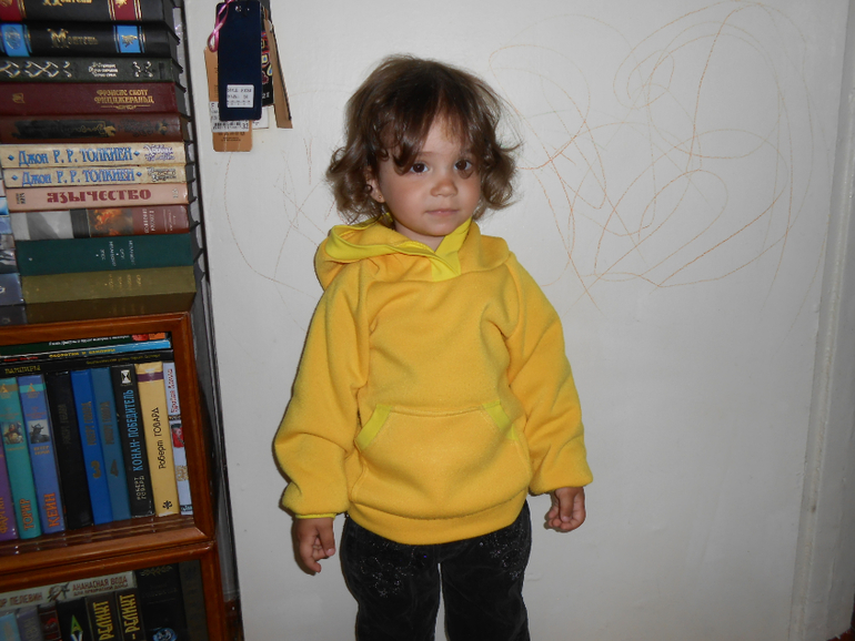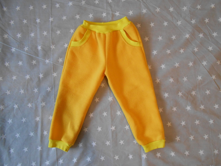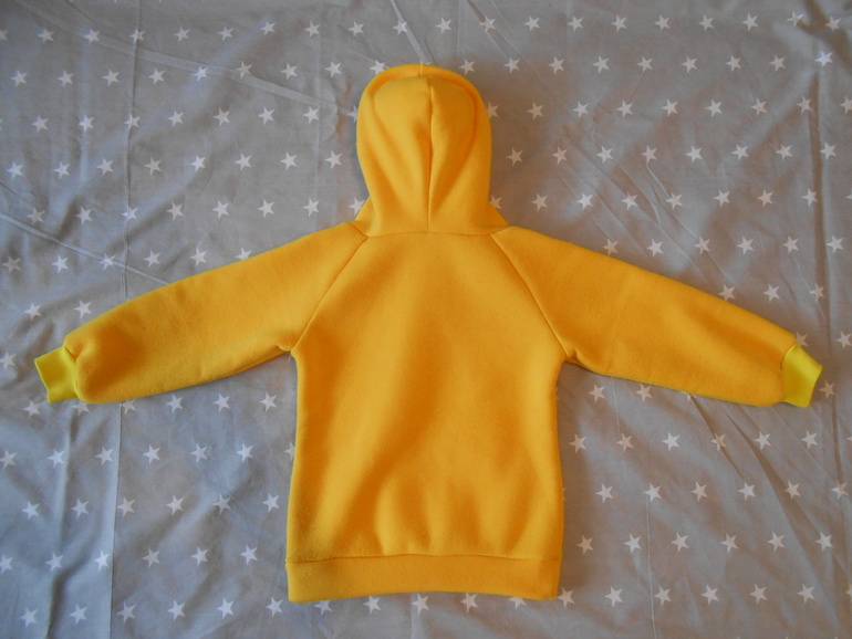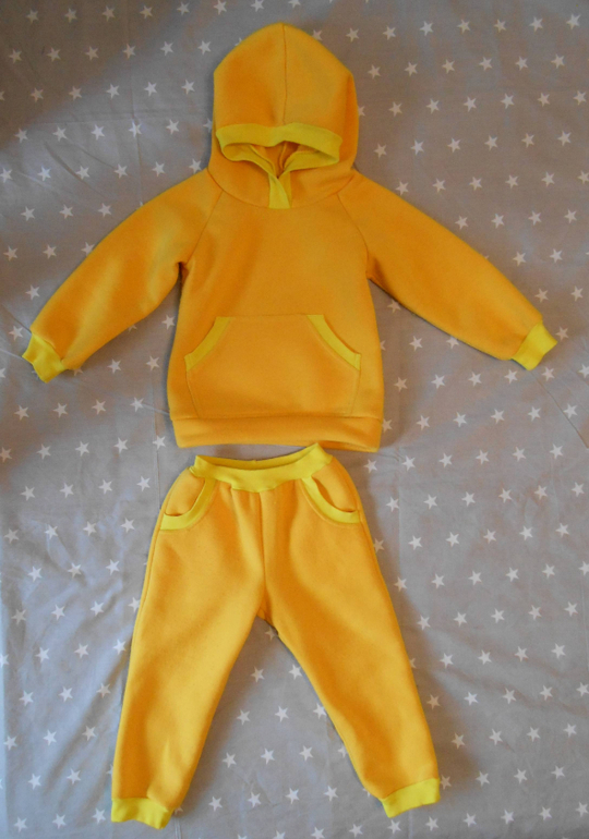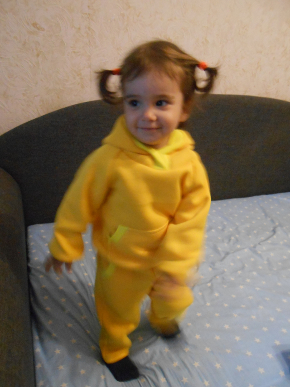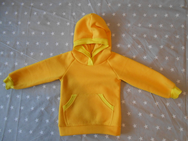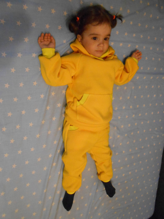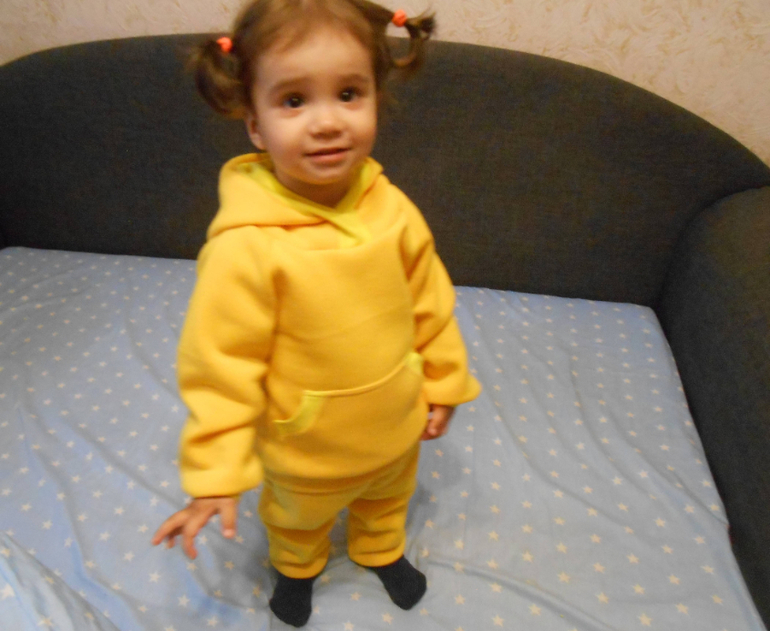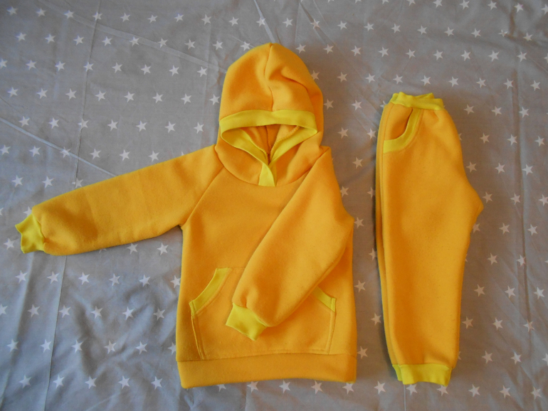 Давно хотела попробовать пошить толстовку с капюшоном. Желтый - любимый цвет моей дочери. А штаны шились просто потому, что ткани как раз и на штаны хватило.