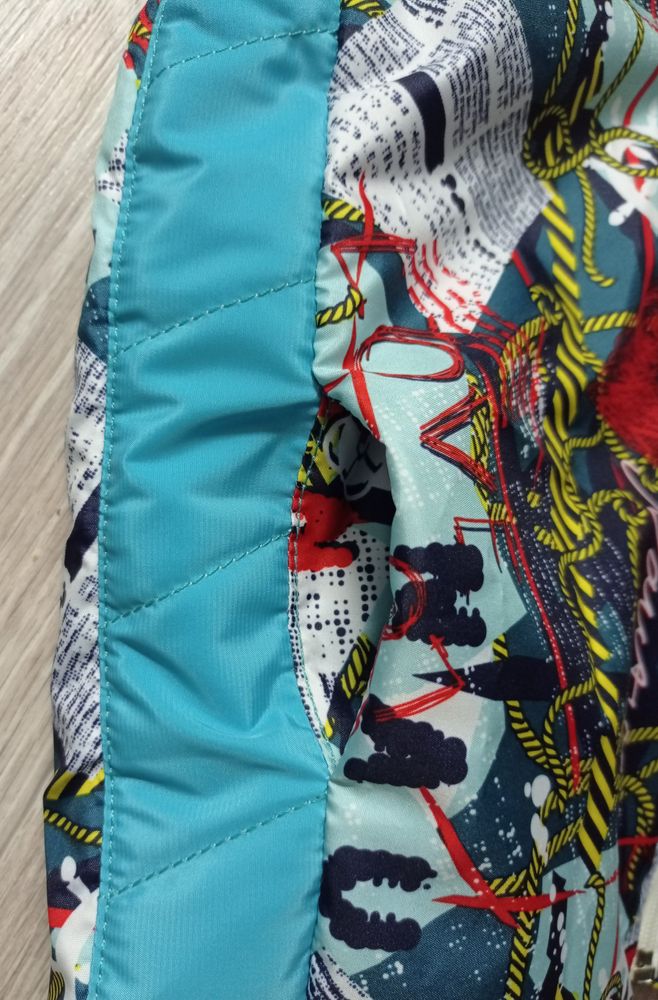 Собственно однотонную тоже утилизировала, так как машинка не шьёт ее вообще никак и ничем, кроме зиз зага мелкого. Хотя качество ткани супер! Яркий принт разбавлен однотонным капюшоном и боковыми вставками с диагональной стежкой. Принта не хватило на полноценную полочку, корила, кстати детали перпендикулярно. Благо на яркой расцветке косяка не видно.