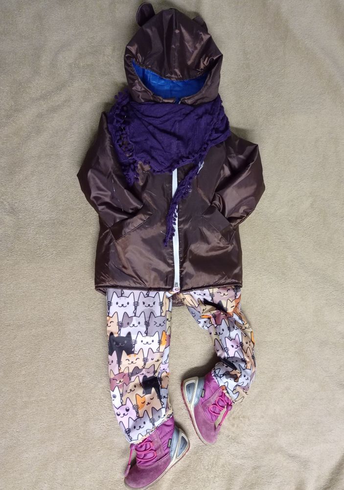 Но не уверена, что впишется в новый комплект. Из за яркого принта пока нет идей с шапкой. Котики ещё остались, вот думаю сшить из них жилет, дошить куртку или с контрастной смотрится хорошо?