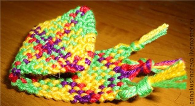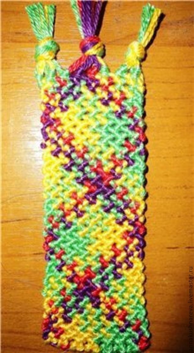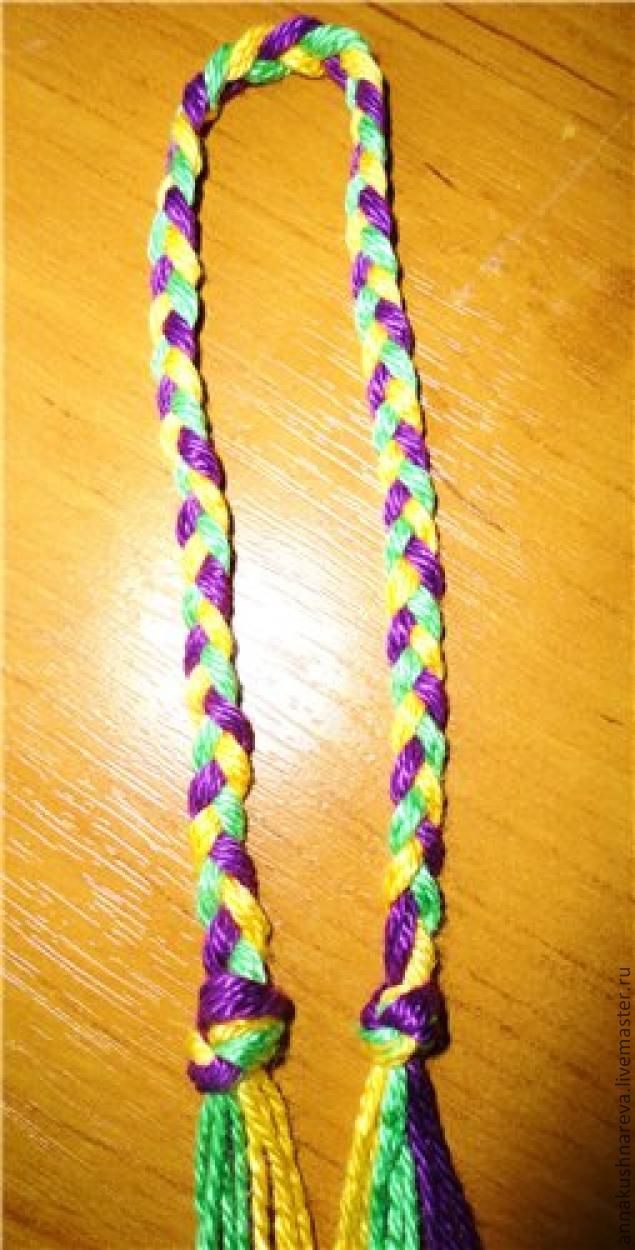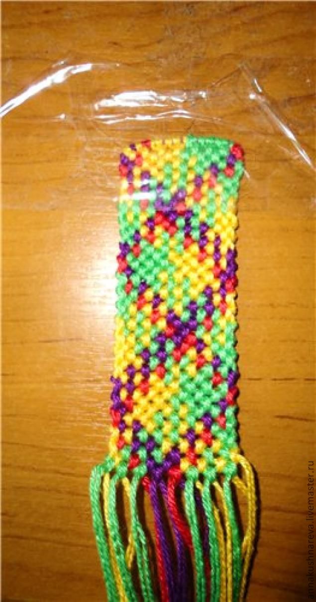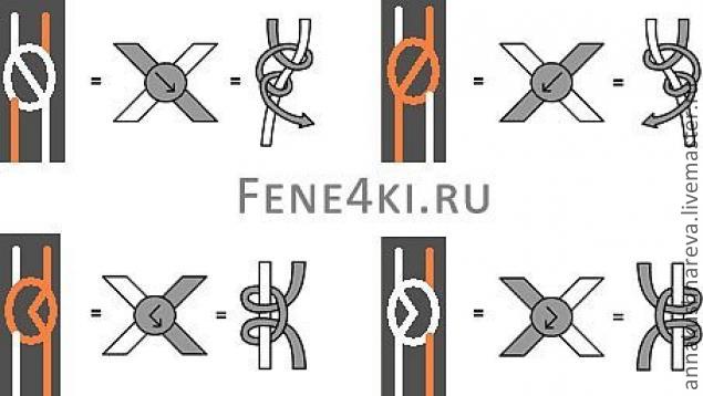 3. Метод плетения, как при создании фенечек. Для этого нам пригодится такая памятка. Стрелка указывает направление нити на схеме. Помните, что узелки нужно завязывать туго, но не переусердствуйте