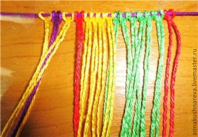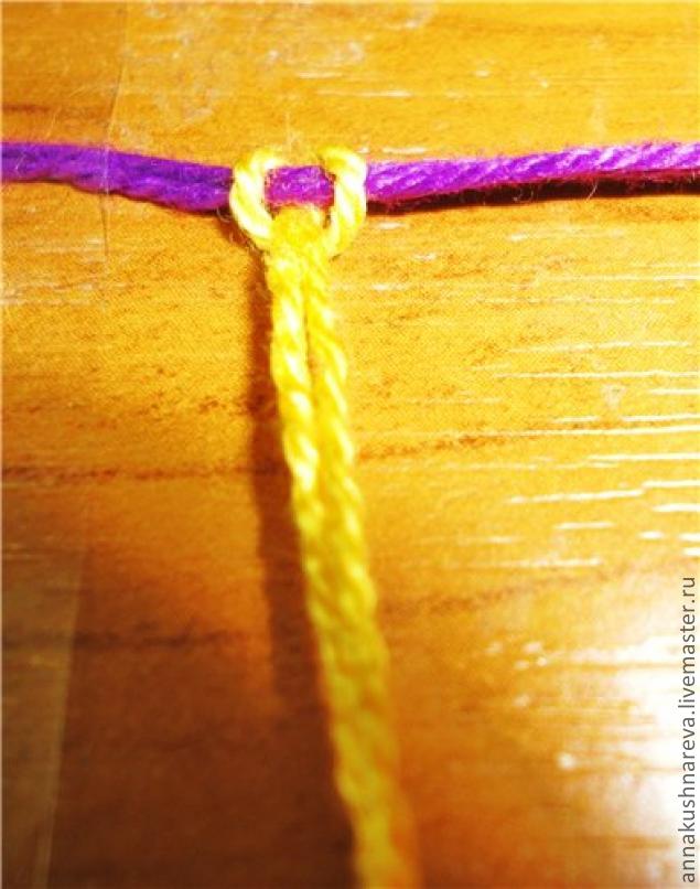5. Далее плетем согласно схеме и про направление узлов не забываем. На схеме представлены два ряда - поэтому мы ее многократно повторяем множество раз, до тех пор пока плетеное полотно по длине нас не устроит. Помните, что крайние - фиолетовые нити тоже участвуют в плетении, согласно схеме!!!!