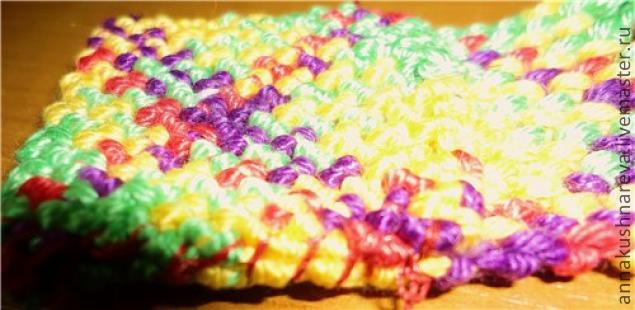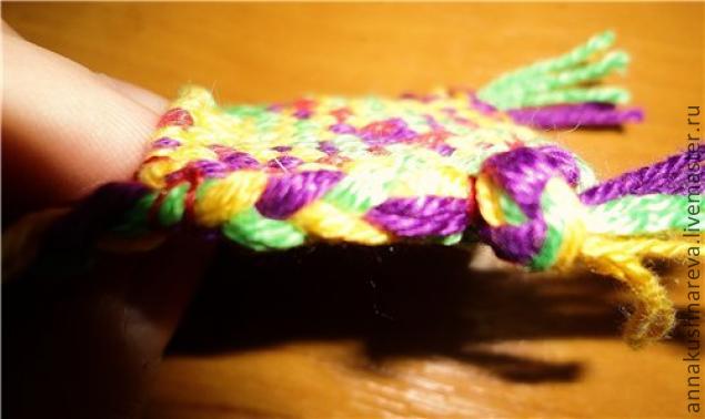 6. Наше полотно готово. Делаем узелочки, обрезаем лишние нитки. Вот здесь явно видны плюсы тоненьких ниток - узелочки и хвостики будут более аккуратными, а если творите сумочку для большой куклы, то можно нанизать бусинки, пуговки!