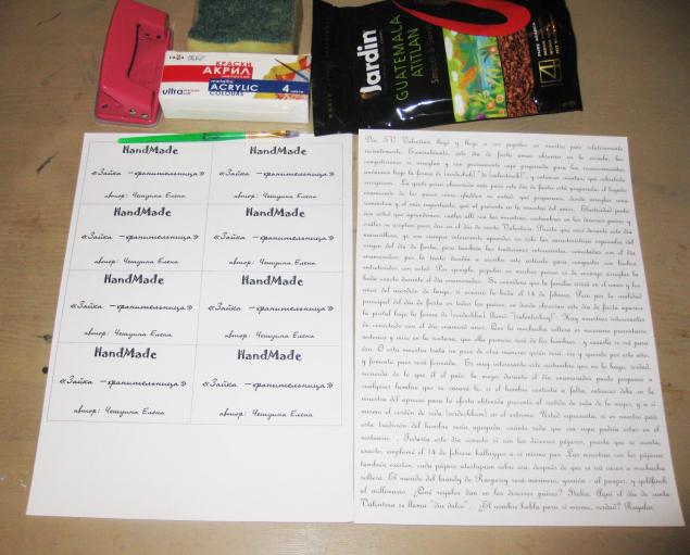 кофе растворимый, губка, краски акриловые, кисточка, бумага (ватман) альбомная, швейная машинка, принтер лазерный, дырокол.