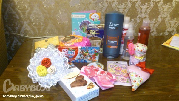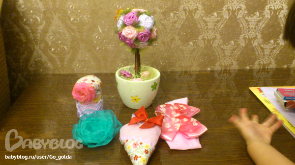 Тут еще одна часть подарков- рукоделки, спасибо наша фея за цветочки, сердечко и бантики!!! Дерево вообще бесподобно, не вериться что оно теперь наше)))))