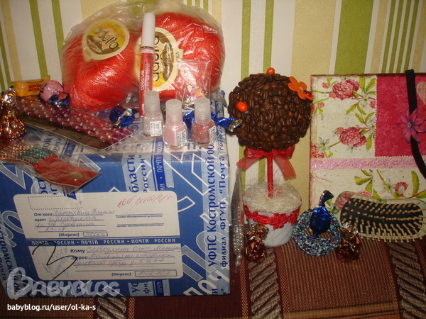 Я рада что вам понравились мои подарки! Я так торопилась, переживала, что вдруг до нового года не придет мой подарок, хотела на всех угодить надеюсь мне это удалось...