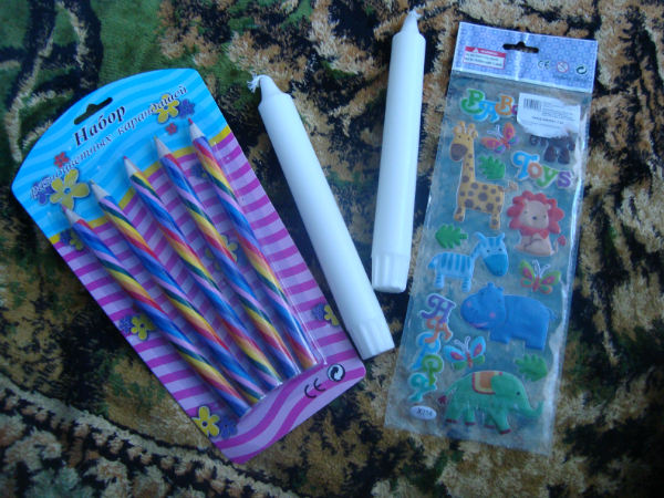 Карандаши цветные (я таких еще никогда не видела), свечи и наклейки