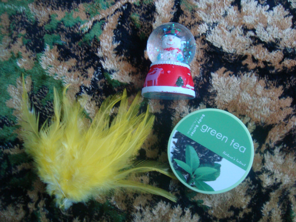 Перья, снеговичок в шарике (супер-пуперская статуэточка!!!!) и крем (кстати с ароматом прям угадано на все 100% очень люблю зеленый чай)