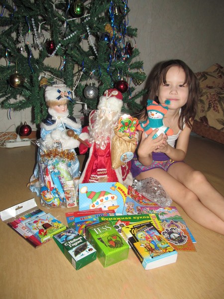Вот это дочка с подарками под елкой( она только что из школы,поэтому лохматая)