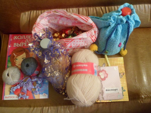 Это общий вид,тут и сладкий подарок и сумочка вязаная и обложка на паспорт,блокнот с ручкой Катеринка себе забрала