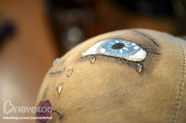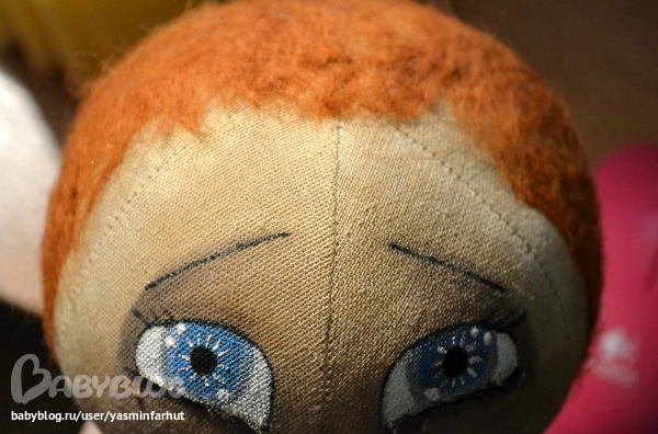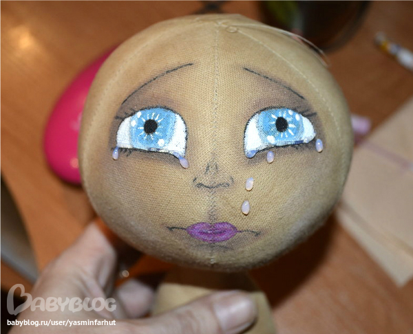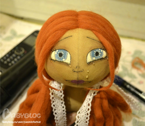 В этой девочке для меня все в первый раз. Совсем иные чем прежде глаза, настроение, иначе собираю ее, в этот раз сначала рисую лицо и делаю волосы, слезы. И впервые я фоткаю этапы рождения куклы. Правда не с самого начала.