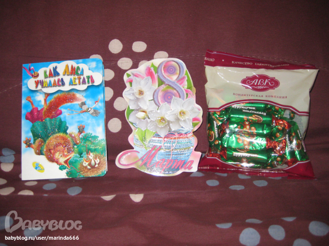 книжечка для малышонка, доне понравилась второй день уже читаем. Конфетки и открытка для нас. Конфеты вкусняшка еле у мужа выпросила парочку себе на утро))