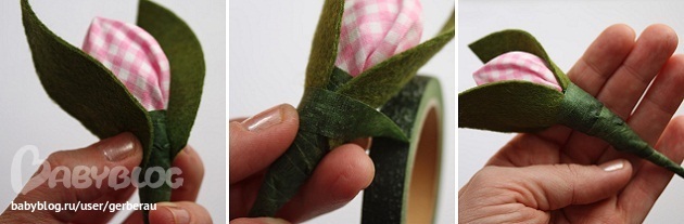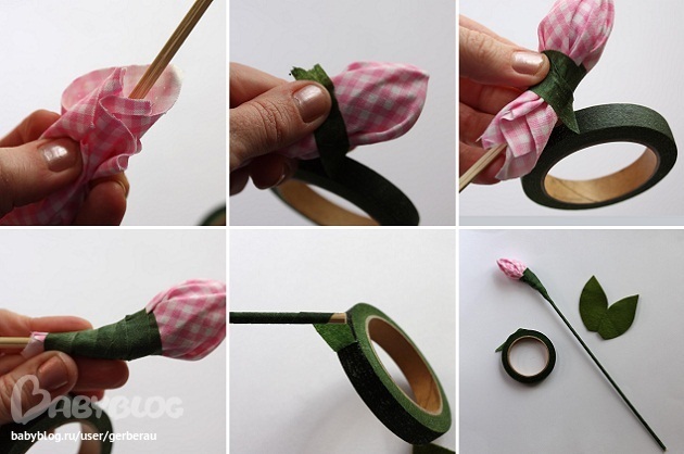 2. Крепим конфетный бутон к шпажке с помощью самоклеящейся ленты.