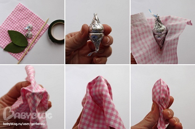 1. Складываем по 2 конфеты основанием друг к другу и заворачиваем в ткань.