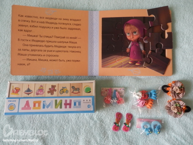 Для старшей дочи детское домино, красивые заколочки и классная книжка с её любимыми героями "Машей и медведем", а внутри книжка ещё и с пазлами( на каждой страничке). Классссссс!