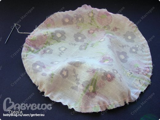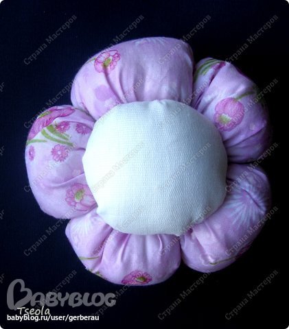 Вырезать 5 кругов для лепестков и 1 круг для серединки. Я воспользовалась блюдцем диаметром 15 см. По краю круга пройтись швом "вперед иголку", положить синтепон, затянуть.