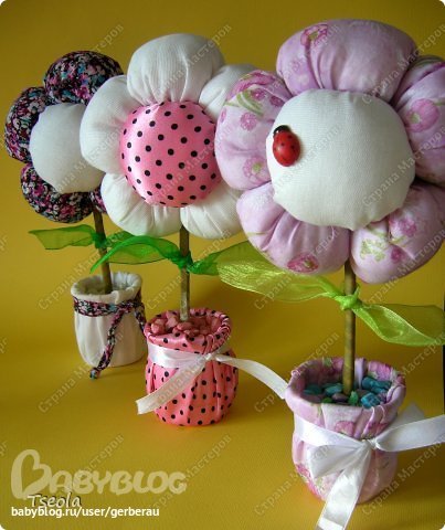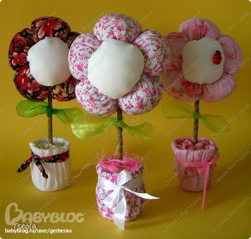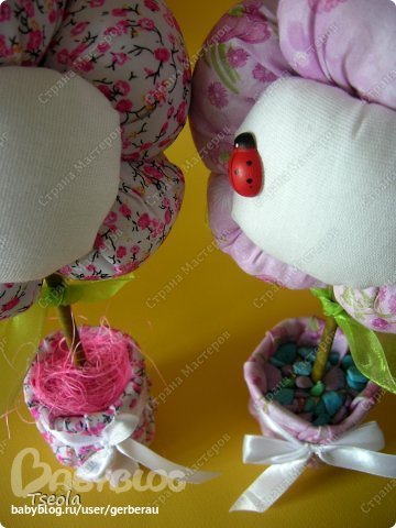 Стаканчик от йогурта оборачиваю тканью и гипсую цветок. Когда гипс немного схватится, кладу декоративную крошку или сезаль. На некоторых наклеиваю божьи коровки - покупные, куплены в цветочном магазине.