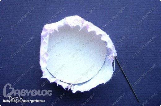 Мы спрячем это неприглядное местечко. Для этого вырезаем из картона круг (у меня диаметром 5 см, у вас возможно потребуется больший диаметр, в зависимости от того, как стяните вместе лепестки) и ткань чуть большего диаметра - обтягиваем картонный круг тканью.