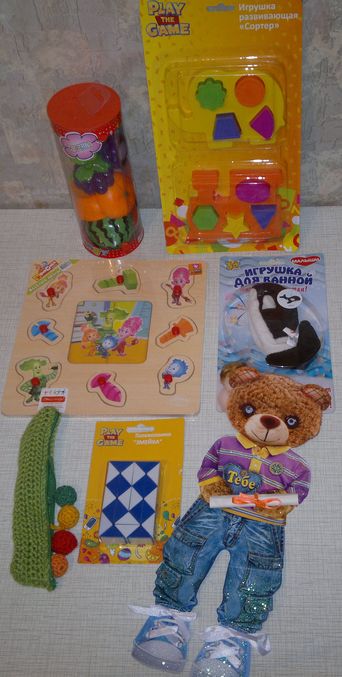 Это Арсюшкины подарки)))) Все подарочки на логику и мышление. Банка с яркими половинками фруктов, которые соединяются в целый фрукт, а потом его можно разрезать ножичком, класс!!!! Сортер в виде паровозика и слоника( это мы любим), деревянная мозаика, головоломка "Змейка" ( как в нашем детстве....настальжиииии) . Игрушка для ванной, кит, его надо бросать в воду и он будет расти, такого я еще не видела)))) Суперская открытка в виде медведя со свертком, а там пожелания и поздравления))) И наконец, стручок горошка , сделанный оч.умелыми ручками Аллочки, если честно, я давно такой хотела, классная развивалка для моторики, СПАСИБО!!!!