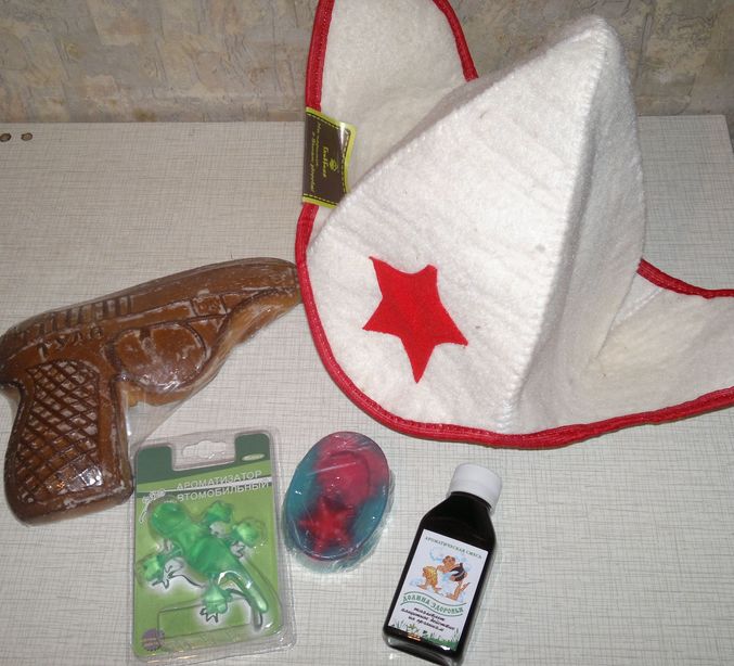 Добрались до папиных подарков. Аллочка умудрилась угадать и соеденить в подарках увлечения, пристрастия и тайные желания( хи-хи) нашего папы.Тут для баньки шапочка-буденовка( осталось коня и саблю, пистолет уже есть) и ароматическая смесь. Для машины ящерка-ароматизатор с ароматом яблочка, вкусняшка)))) Мылко самосваренное со звездой и крабом и чудесным ароматом иланг-иланг.И вот оно, тайное желание..... огнестрельное оружие, пока только пряник, но, главное нАчать)))) Привет и огромное спасибо тебе, Алла, от нашего папы