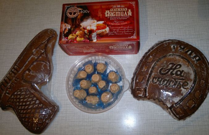 Сладости, как же без них)))) Пастила, не пастила, а песня, кто ее пробовал, счастливый человек! И конфетки очень не обычные и ну, оооочень вкусные. Пистолет, вы уже видели. И подковка на счастье)))) Спасибо, дорогая!