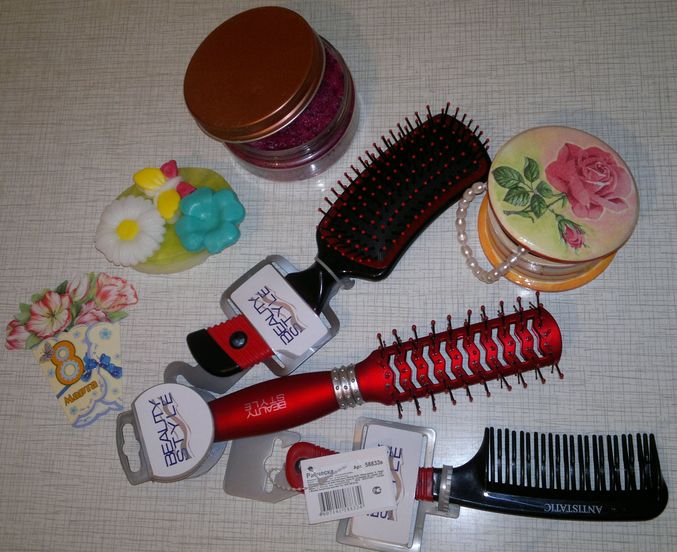 Это Сонины подарочки. Очень красивые и очень полезные расчески. Маленькая открыточка. И три вещи сделаные, опять же,оч.умелыми ручками нашей феечки)))