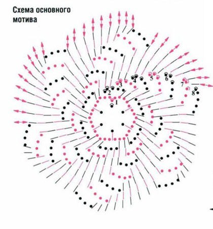 Основной мотив (104 шт.): набрать цепочку из 6 в. п. и замкнуть в круг с помощью соед. ст.