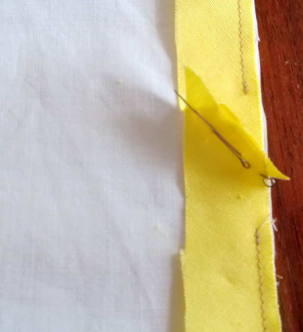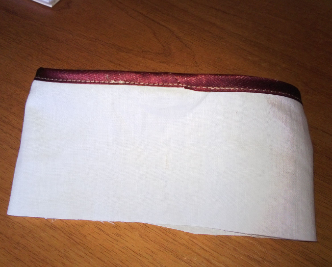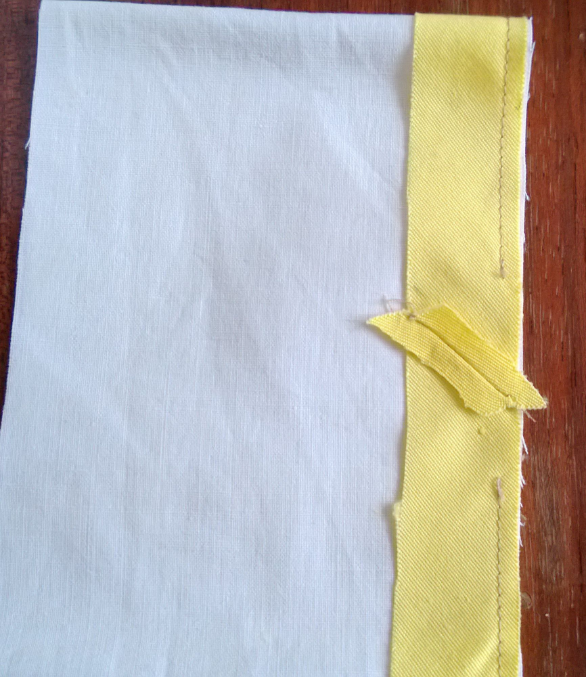 А если, вдруг, нам повезло и у нас есть готовая бейка, то проводим с ней почти такие же манипуляции, как и с самодельной. Так же не застрачиваем небольшой участок среза( лучше побольше, чем в первом варианте).
