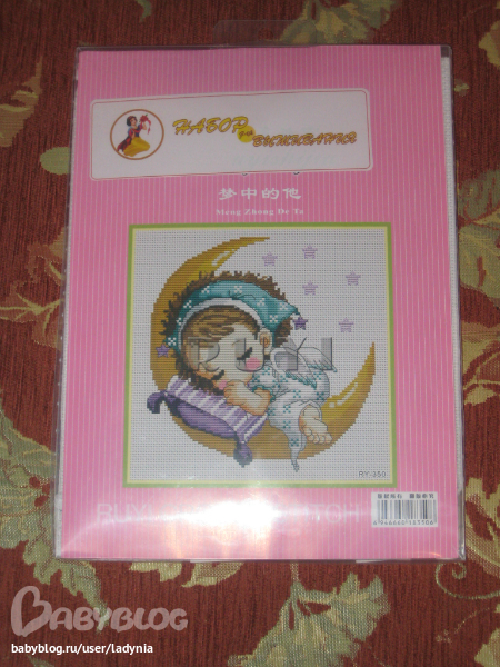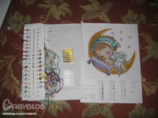 Канва жесткая, 2 иголки в наборе, нитки металлизированные для луны и для крылышек с люрексом. Скажу честно замучилась ими вышивать (металлизированными нитками, постоянно закручивались), но результат мне понравился.