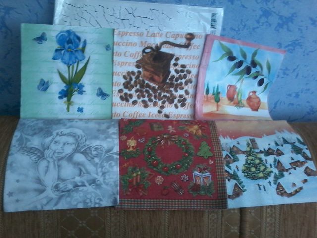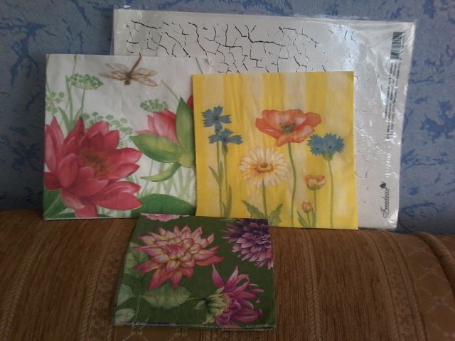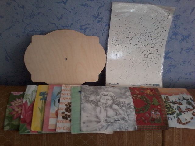 Кракелюрная пленка ( я такую не видела никогда, у нас такого днем с огнем не сыщешь))), заготовка для часов и очень красивые салфеточки.