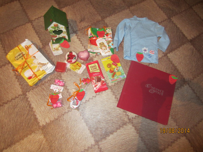 Чайный домик, я давно о нём мечтала.весь в клубничках.и все подарочки были с рукадельными клубничками и подписаны. а какое мыло))) какой запах.тоже сделано ручками Аллы))).сколько вкусняшек. ленточки и пуговки для моего хомяка.нашему папе обалденная книжка про холодное оружие. сыну старшему прикольные стёрки,доче резиночки.малышу кофточку наш размерчик)).вот такая у нас супер посылочка!!!!!!!но и ещё несколько фото