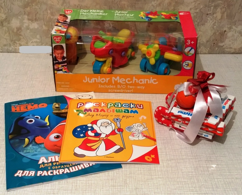 Это для самого маленького члена нашей семьи- Сеника. Сладкие саночки были сделаны с душой и любовью, но не вынесли суровой Российской зимы, развалились..... я их собрала, как смогла(((( Очень много шоколада , мы его очень любим и уважаем))))) А в коробочке шурповерт и самолет с мотоциклом, которые можно разобрать при помощи волшебного инструмента. Сеня весь вечер откручивал-откручивал и откручивал, а папа собирал, собирал, собирал..... А на ночь Сеня взял с собой шурповерт в кровать, видимо, в ночную пошел...