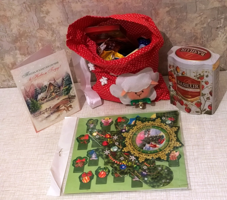 Это общие подарки, я так поняла)))) Душевная открыточка, невероятно ароматный чай, гора конфет, а на каждой конфетке- пожелание, представляете, как здорово придумано! И картонная елочка с игрушками)))) Чуть попозже будем собирать....