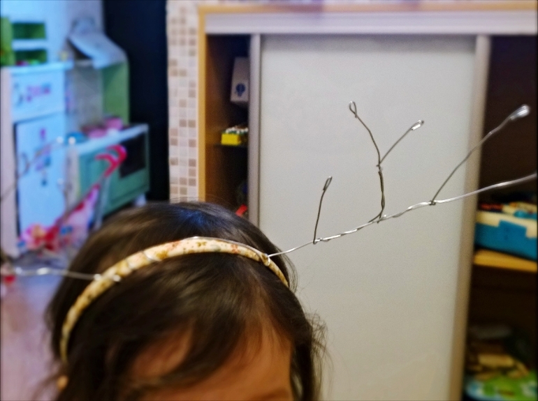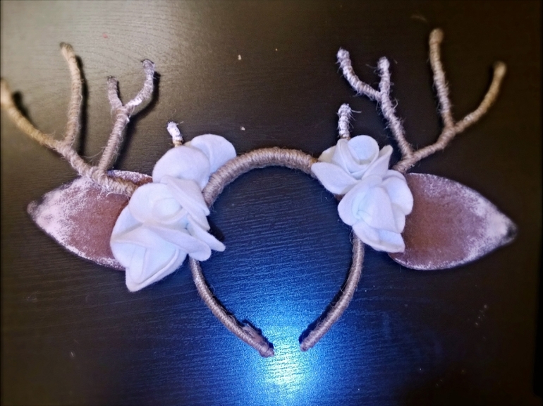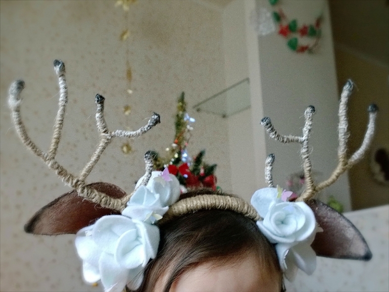 для нас это настоящий праздник, приглашаем родных и друзей, накрываем стол. И к этому дню сделала для дочки рожки олененка. А творила это чудо просто и быстро. Сгибая проволоку, создала подобие веток и прикрепила на ободок, потом аккуратно обмотала бечевкой все изделие вместе с рожками. Жалко не сразу сообразила, что надо было рожки из проволоки обмотать синтепоном и только потом обмотать бечевкой, тогда бы получились по толще. Переделывать не стала (нет синтепона). Потом пришила ушки из фетра и украсила цветочками из такого же материала, немного штрихов акрилом для реалистичности и вуаля рожки готовы!