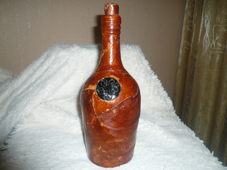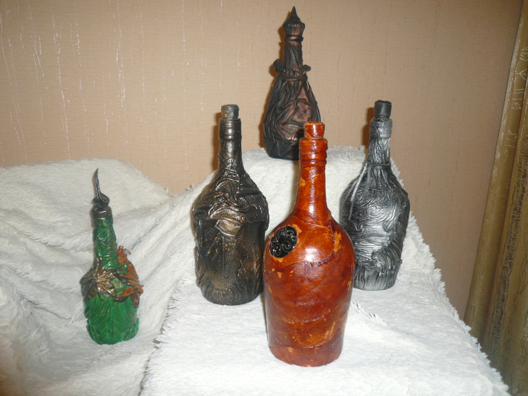 Работы из кожи и мехаМои бутылки в натуральной коже. Для декора и конечно для самодельного вина.