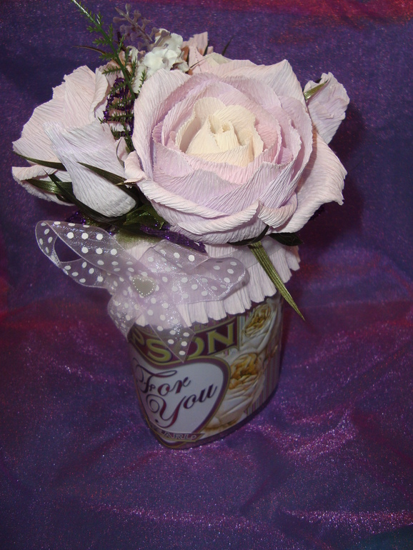 Очень красивый сиреневый букетик с чаем, чай "Для тебя" с ароматом молока и розы. А в цветочках конфетки! Юль, я еще в твоем посте заглядывалась на этот букетик;))