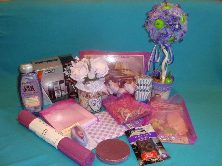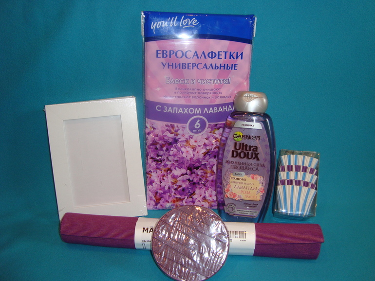 А здесь все в лавандовом цвете: салфетка с запахом лаванды, рамочки для фото, шампунь (очень приятный запах), формочки для кексов. Салфетка на стол (все в моем цвете!!) и подставки под чашки-стаканы.