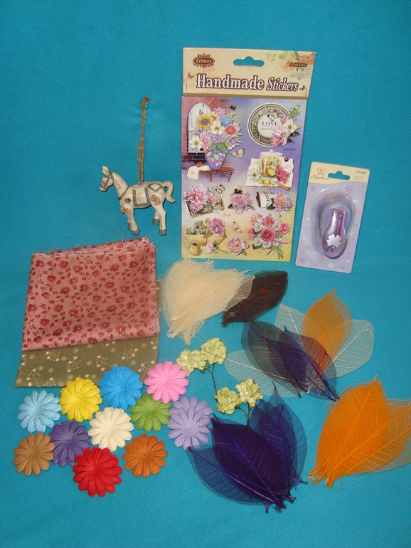 А это радость моему хомяку: ткани, цветочки и листики для скрапа, дырокол фигурный и объемные наклейки. Чудесная лошадка-подвеска! Все такое классное!!!!!!!!