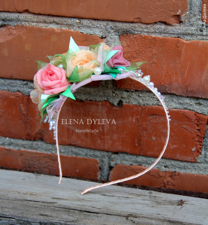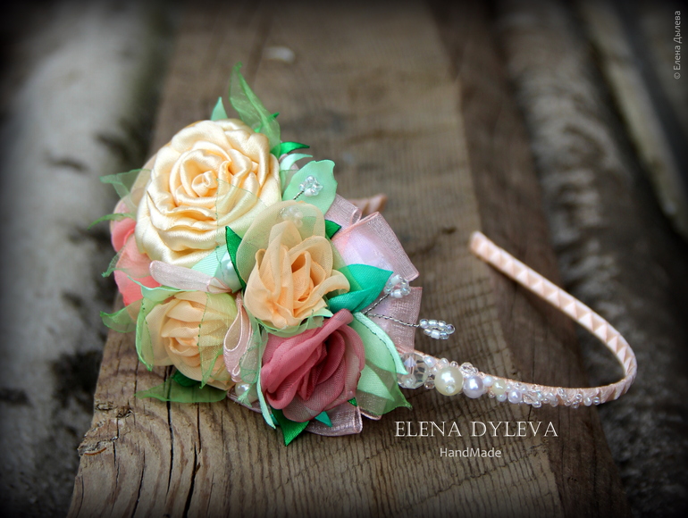 Цветы выполнены из шифона, атласной ленты, вуали, органзы. Ободок оплетен атласной лентой и расшит бусинами, бисером.